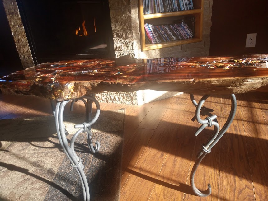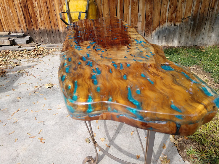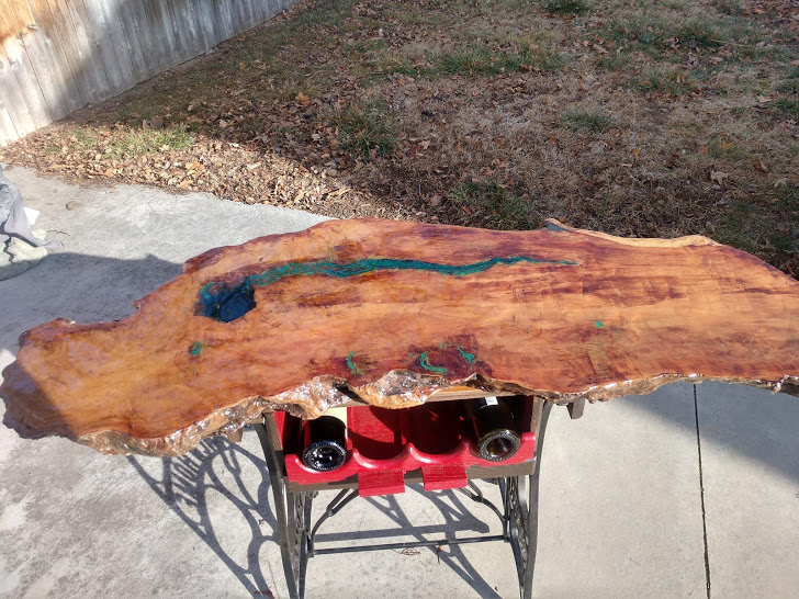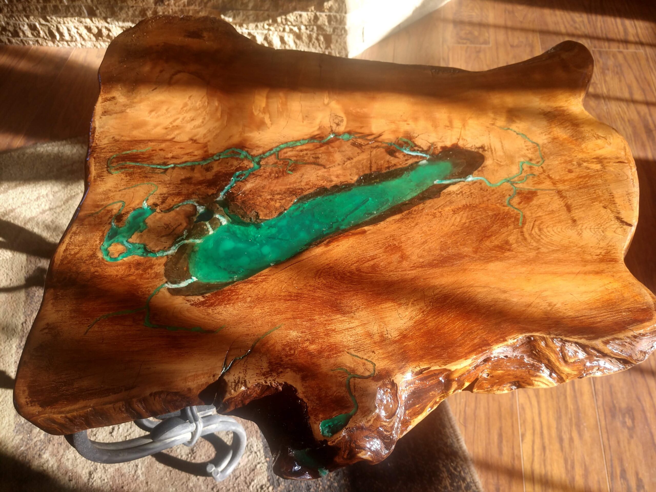Depressions in the Myrtle wood reminded Dan of the Gen Seng root. Influenced by Dan’s love for wilderness areas. Dan filled those in with green and blue epoxy. Afterwards sealing it with a clear epoxy coat.